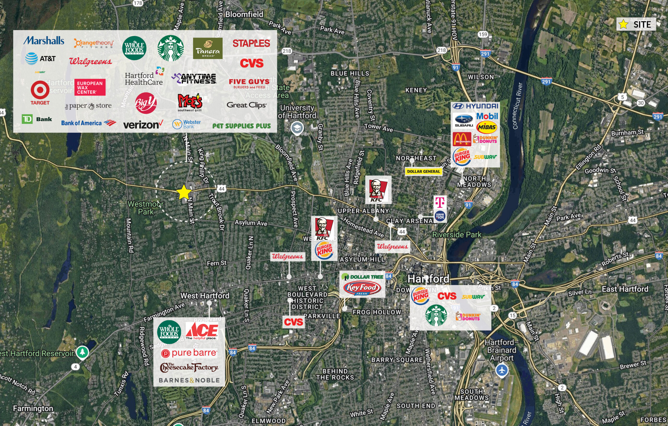 Located 4 miles west of downtown Hartford in a high-income, densely populated retail corridor
