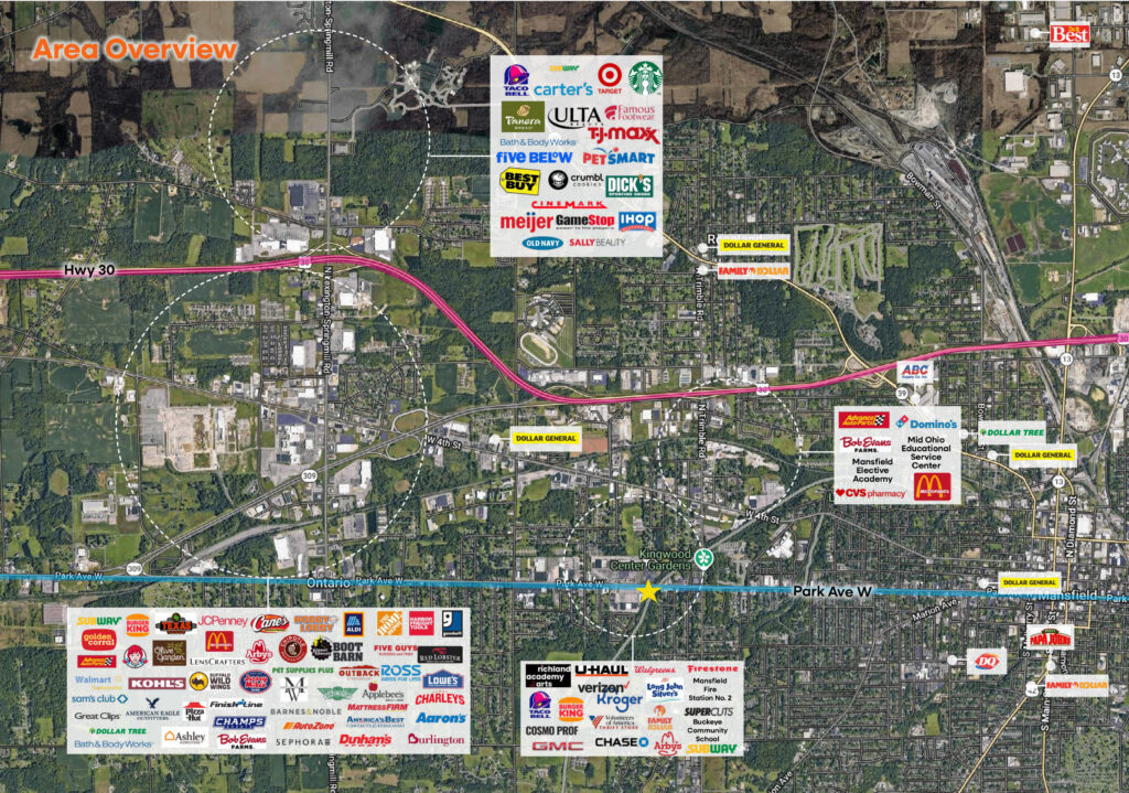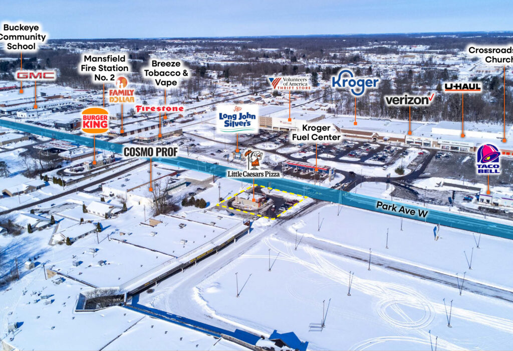 The property is strategically located along Park Avenue West (State Route 430), one of Mansfield’s primary east–west commercial corridors, offering strong visibility and consistent traffic flow. The property is directly adjacent to a Kroger-anchored destination grocery center and benefits from strong national co-tenancy, including Firestone, Family Dollar, Taco Bell, Burger King, Arby’s, Verizon, and Chase Bank – underscoring the corridor’s proven retail demand and long-term viability.