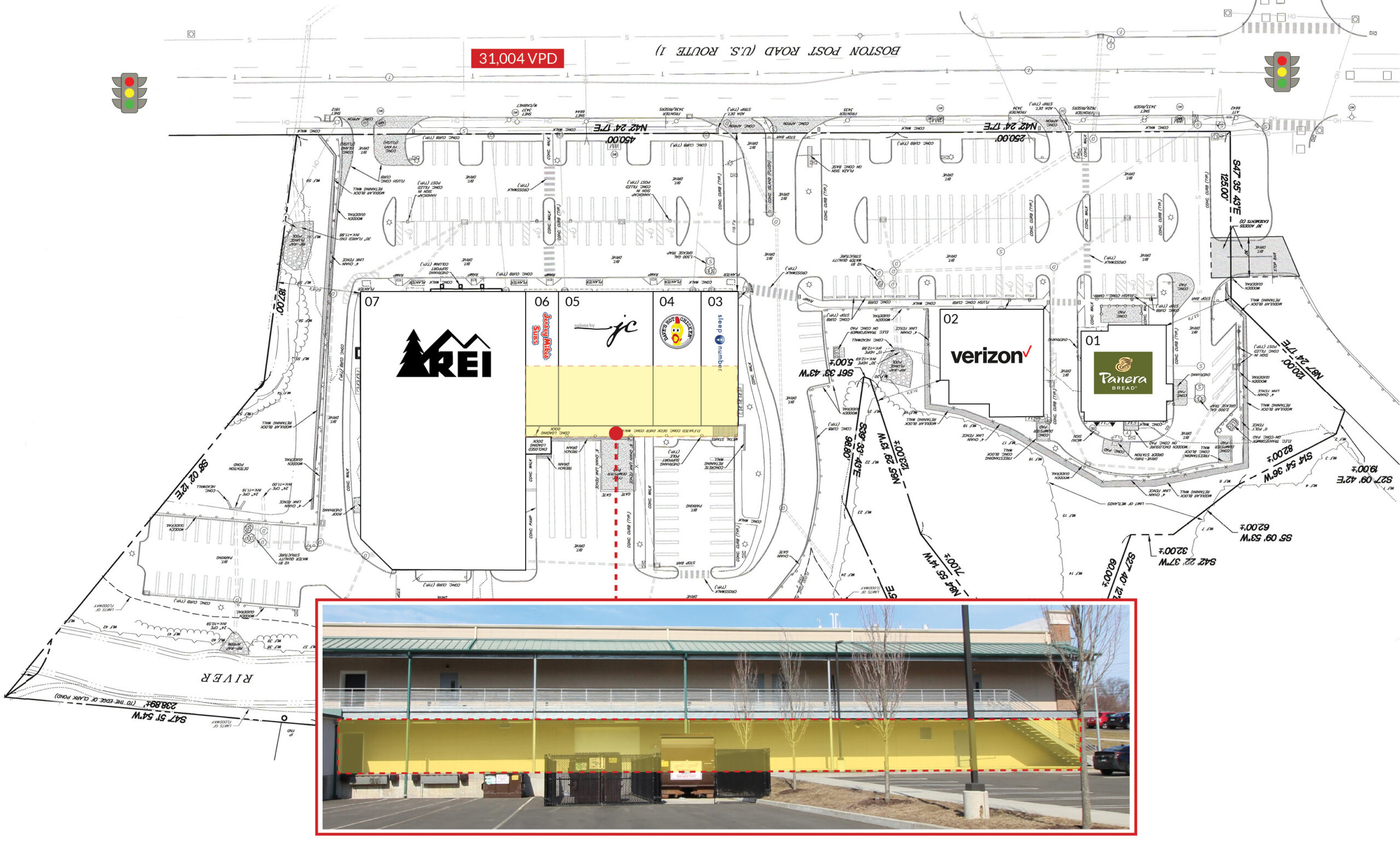 Milford Square sits between two traffic light intersections, and across from a Whole Foods anchored shopping center